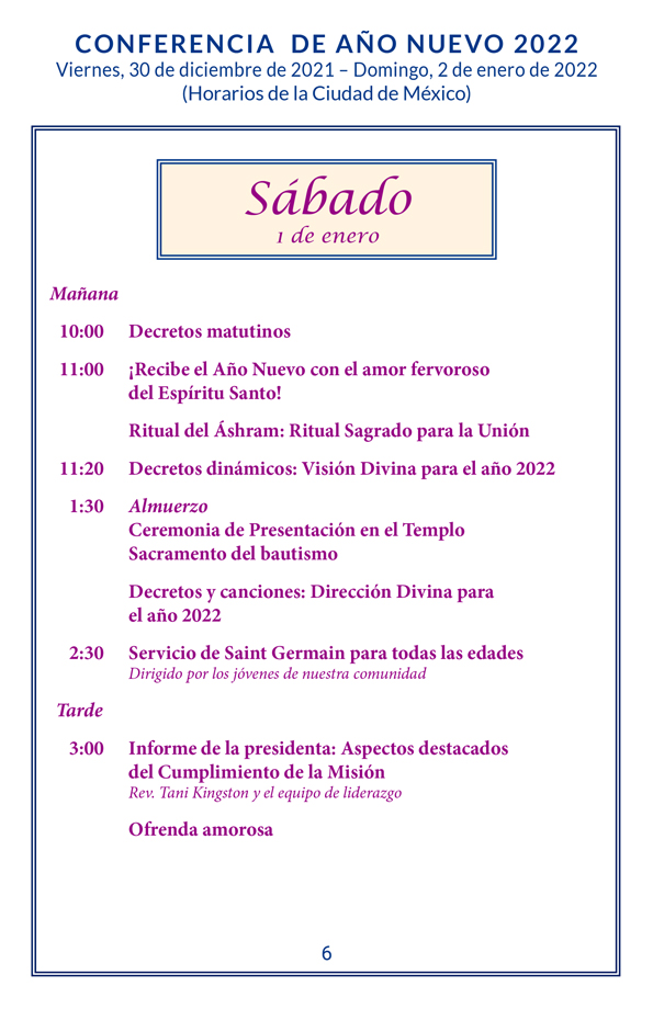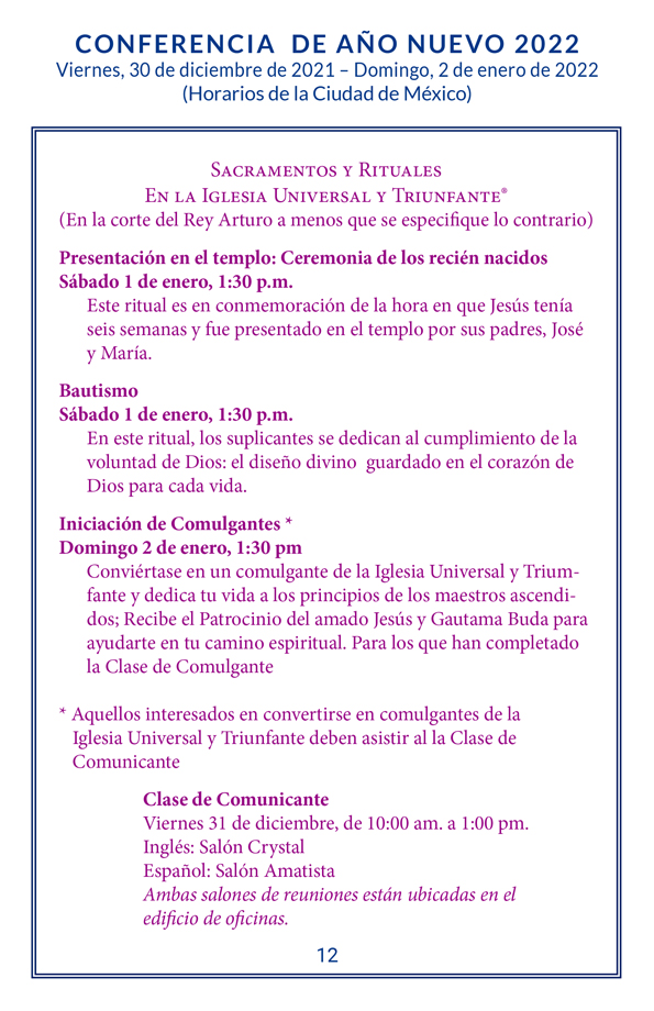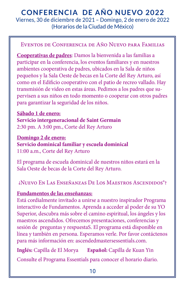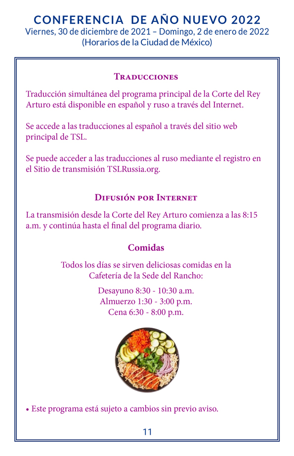 La asistencia está abierta para todos. Se recomienda la preinscripción. Por favor, comprende que la gente vive y trabaja aquí en el Rancho Royal Teton. Nuestra actividad más importante es participar en los decretos y servicios en la Corte del Rey Arturo. Si tienes síntomas de enfermedad contagiosa, no puedes entrar en la Corte, la cafetería o el Edificio de Oficinas. Te rogamos que cumplas con nuestras prácticas u optes por participar en la conferencia en la transmisión. Si presentas algún síntoma de enfermedad contagiosa, se te puede pedir que permanezcas en tu habitación si te alojas en el campus.